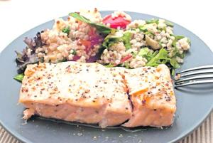 Salmón al horno con ensalada de quínoa y vegetales al vapor por evelyn figueroa (nutricionista de aramark)
