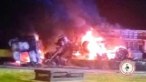 Camión volcó y terminó incendiado